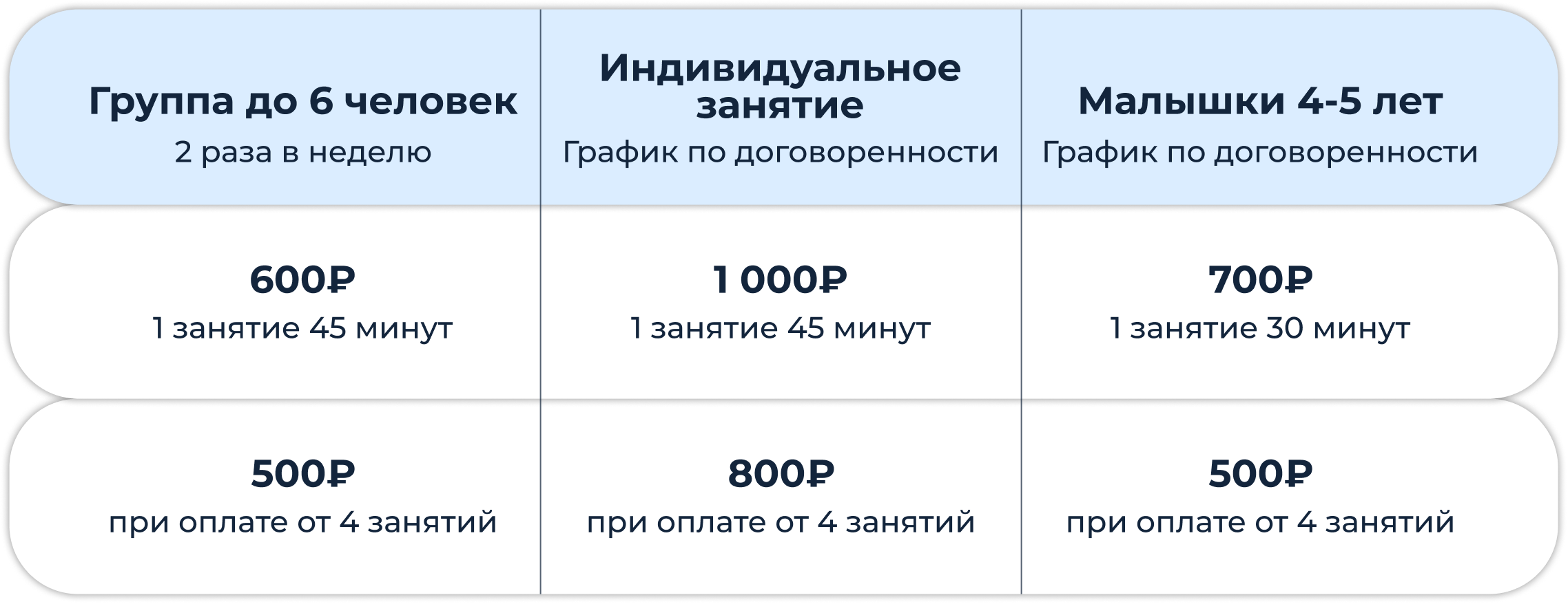 Мы предлагаем индивидуальную модель обучения для каждой возрастной группы, с учётом уровня и целей. Каждый ребёнок — особенный, и мы находим подход к каждому!